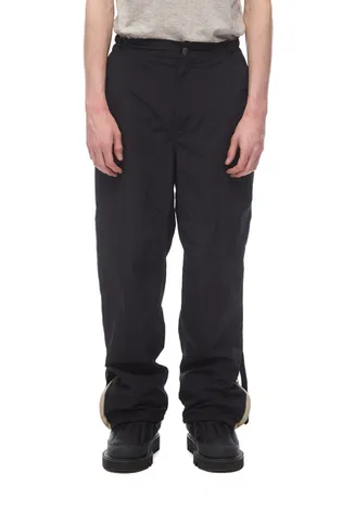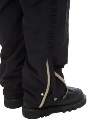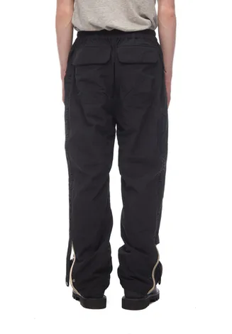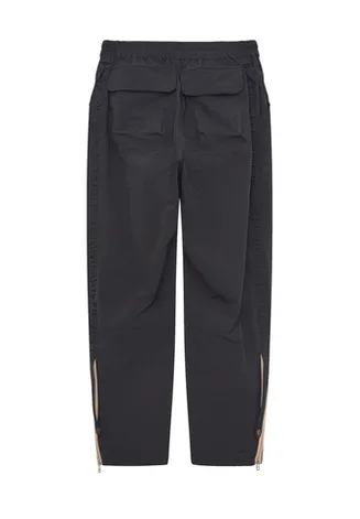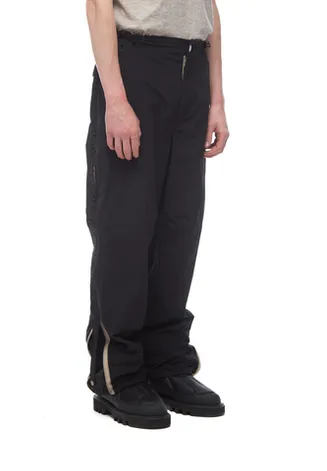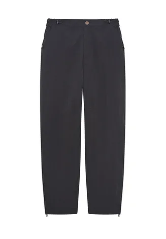 Пять карманов: два боковых наклонных на кнопках, два задних накладных с клапанами и один скрытый карман на молнии в правом боковом шве. Сетчатая подкладка обеспечивает вентиляцию. Низ брючин оснащен молниями для регулировки объема.
