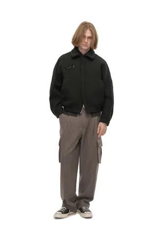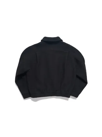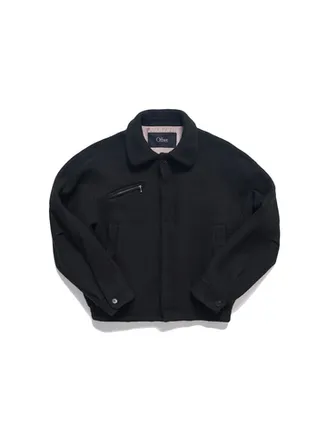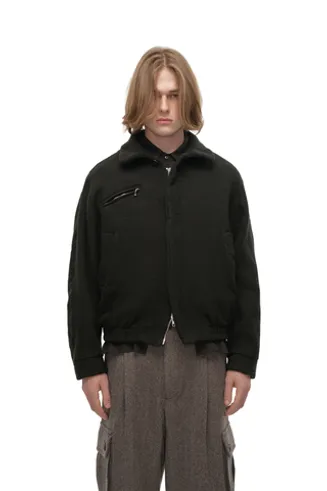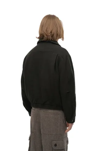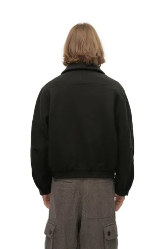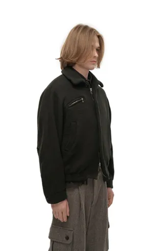 Развитие силуэта нашего классического шерстяного бомбера. Модель создана с применением техники garment boiled — термической обработки уже сшитого изделия. Под воздействием температуры структура ткани меняется: при высокой плотности (680 г/м²) шерсть становится более мягкой и приобретает естественные влагоотталкивающие свойства. Куртка теряет первоначальную жесткость, приобретает слегка винтажный облик, становится пластичной и садится точно по форме.