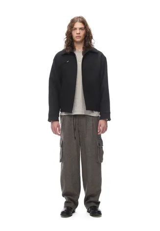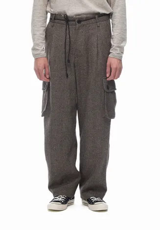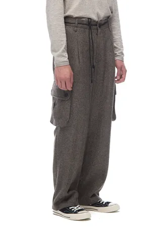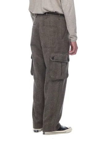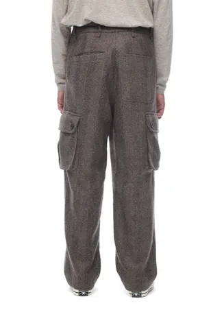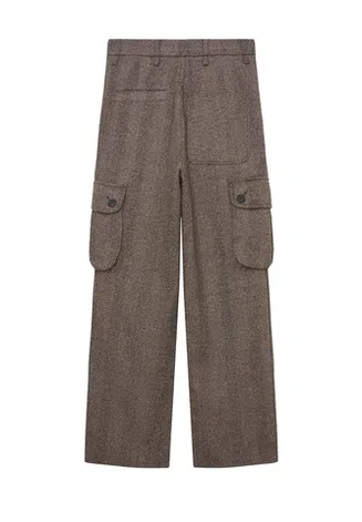 Брюки-карго из твида с рисунком «елочка» (Herringbone). Прямой крой сочетает классическую фактуру ткани и утилитарные элементы: боковые карманы, задние накладные карманы и дополнительный карман с клапаном. Полноценная хлопковая подкладка по всему изделию обеспечивает комфорт и тепло в холодный сезон.
