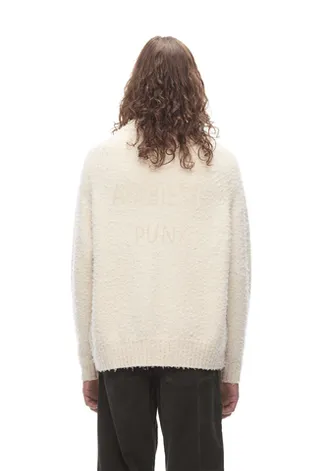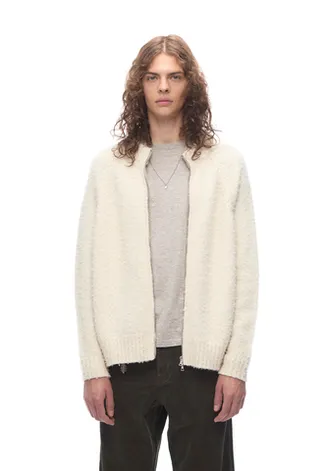Кардиган свободного кроя на молнии из мериносовой шерсти. Техника «pile brushing» создает выразительную фактуру поверхности и делает материал особенно мягким и объемным. Высокий воротник-стойка, эластичные манжеты и нижняя резинка формируют комфортный силуэт.
