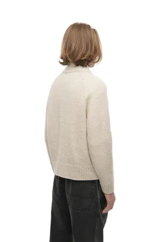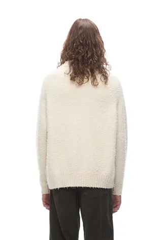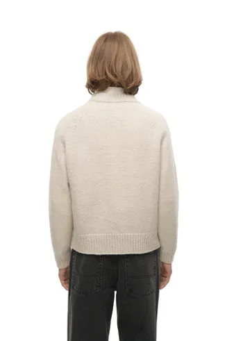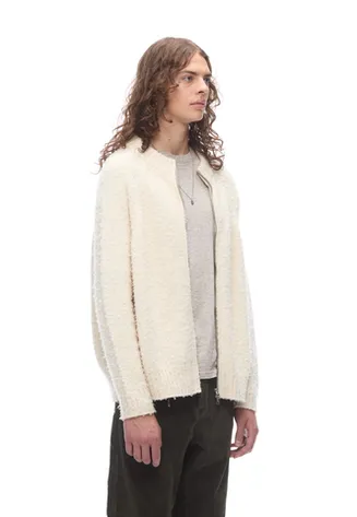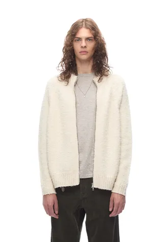 Кардиган свободного кроя на молнии из мериносовой шерсти. Техника «pile brushing» создает выразительную фактуру поверхности и делает материал особенно мягким и объемным. Воротник-стойка, эластичные манжеты и нижняя резинка формируют комфортный силуэт.