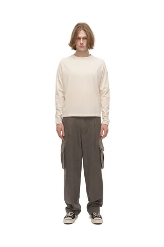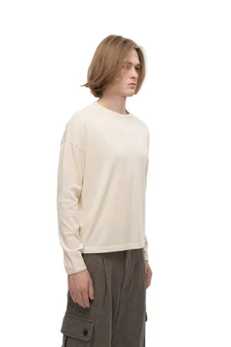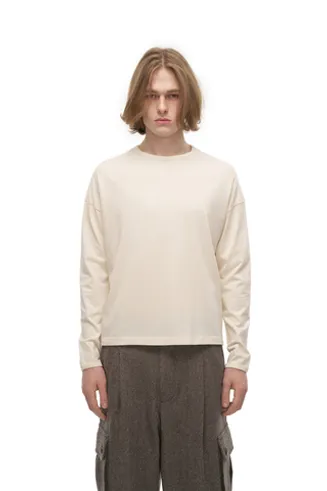 Лонгслив из японского трикотажного полотна качества «пенье». Выполнен из 100% хлопка, произведённого на фабрике «Сибая» (Shibaya), Япония. Материал плотностью 153 г/м² — лёгкий, тонкий и эластичный трикотаж с шелковистой поверхностью. Ткань гипоаллергенная, обладает высокой воздухопроницаемостью и отличной гигроскопичностью, что делает лонгслив комфортным для чувствительной кожи и жаркой погоды. Крой свободный, расслабленный, слегка расширенный и укороченный, гендерно универсален. Особое внимание уделено обработке горловины и низа рукавов — срезы аккуратно окантованы, скрывая припуски и обеспечивая комфорт при носке.
