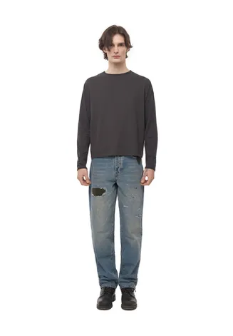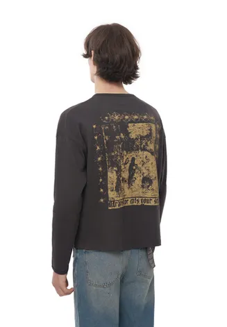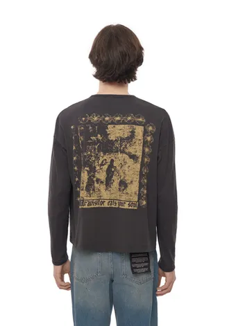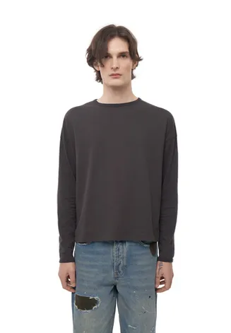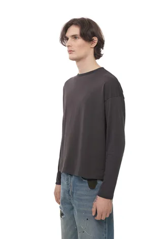 Лонгслив из японского трикотажного полотна качества «пенье». Выполнен из 100% хлопка, произведённого на фабрике «Сибая» (Shibaya), Япония. Материал плотностью 153 г/м² — лёгкий, тонкий и эластичный трикотаж с шелковистой поверхностью. Ткань гипоаллергенная, обладает высокой воздухопроницаемостью и отличной гигроскопичностью, что делает лонгслив комфортным для чувствительной кожи и жаркой погоды. Крой свободный, расслабленный, слегка расширенный и укороченный, гендерно универсален. Особое внимание уделено обработке горловины и низа рукавов — срезы аккуратно окантованы, скрывая припуски и обеспечивая комфорт при носке.