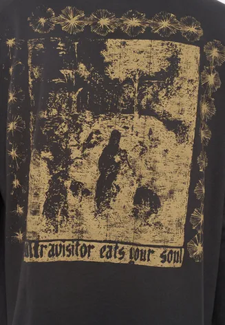 Надпись на принте, Ultravisitor Eats Your Soul («Ультрагость съест твою душу») это размышление о хаосе и порядке, разрушающем и создающем одновременно. Принт показывает столкновение классического духовного поиска с современным техногенным вмешательством, которое «съедает душу» и заставляет переосмыслить личность в новую эпоху.