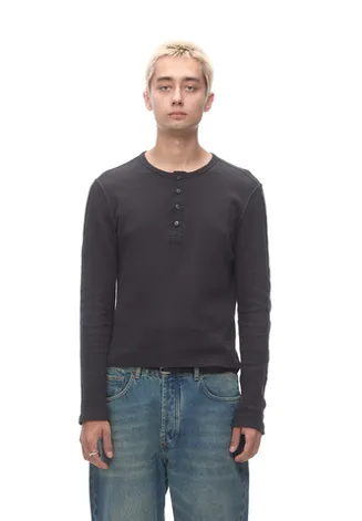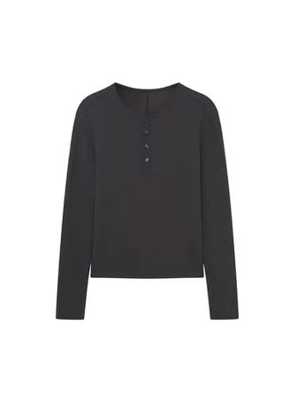 Лонгслив из фактурного японского трикотажа в рубчик с планкой на пуговицах и круглым вырезом горловины. Конструктивная особенность — отсутствие боковых швов и смещение нижнего шва рукава к центру внешней части. Это создает анатомическую посадку и делает носку максимально комфортной. Фактурное плетение в рубчик добавляет эластичности и сохраняет форму.
