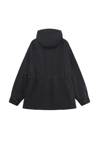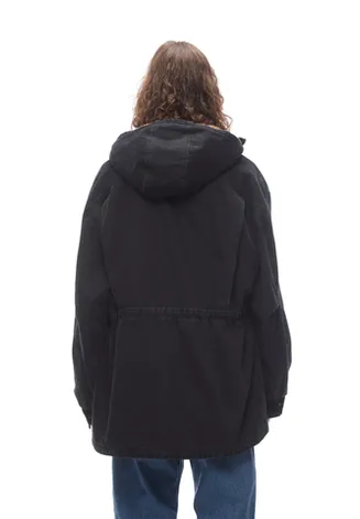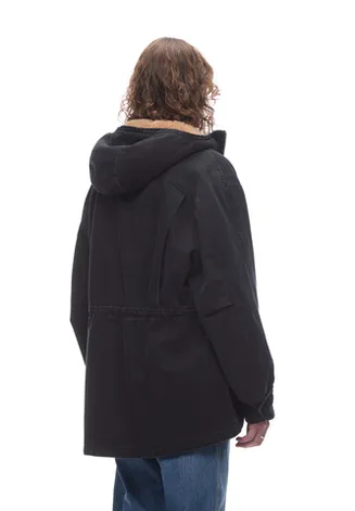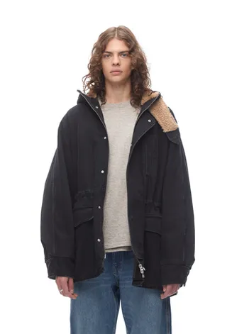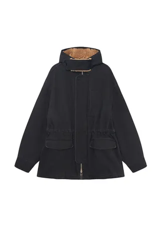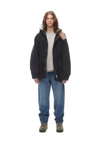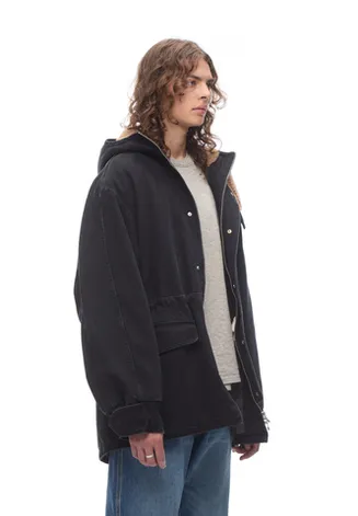 Парка прямого силуэта из хлопкового денима. Застежка на металлическую молнию и кнопки. Два объемных прорезных кармана с клапанами, внешний нагрудный карман и два внутренних кармана. Капюшон с меховой отделкой и утяжкой по талии. Подкладка из хлопка, утеплитель.