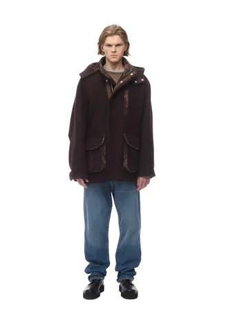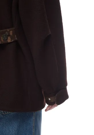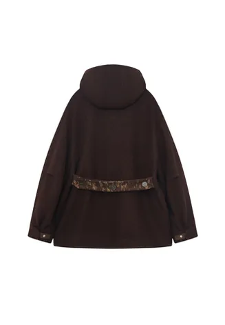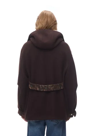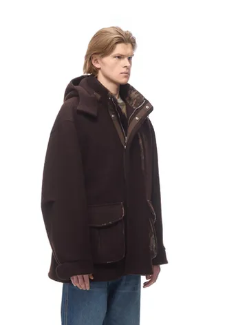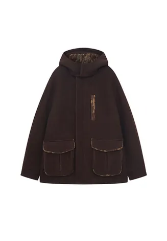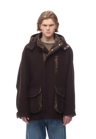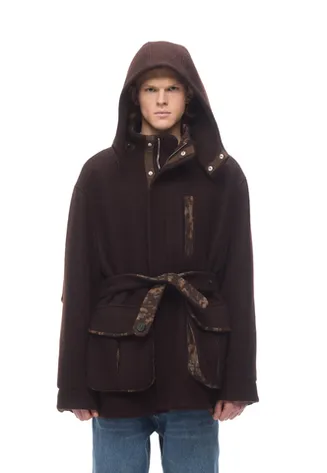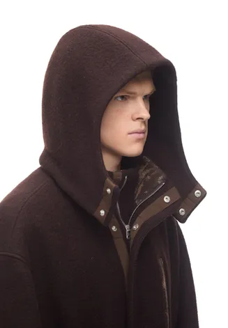 Пальто прямого силуэта из итальянского шерстяного джерси. Съемный капюшон на пуговицах, высокий воротник с контрастной отделкой. Передние накладные карманы с клапанами и контрастной окантовкой, два внутренних кармана. Застежка на молнию и кнопки. Подкладка из итальянского хлопка. Использованы молнии RiRi и роговые пуговицы. Основная ткань сочетает шерсть и полиэфирное волокно с повышенной эластичностью: материал легко тянется и быстро восстанавливает форму.