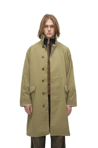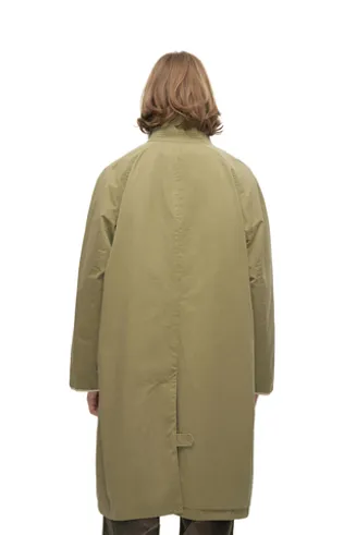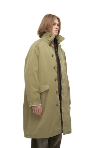 Плотная, но мягкая хлопковая ткань дает изделию высокую натуральную подвижность и комфортную посадку. Внутри — два кармана: один на молнии YKK, другой открытый; а снаружи помимо двух накладных на пуговицах маленький, почти декоративный карман, размером под зажигалку «биговского» формата. Скрытые роговые пуговицы, ветрозащитный хлястик для горла под круглым усиленным воротником, застегивающимся на крючок. Для вентиляции предусмотрены латунные люверсы в области подмышек, а контрастная окантовка внутренней части рукавов добавляет едва заметный акцент и иллюзию дополнительного слоя. Визуально плащ сдержанный и строгий, но с важной для нас утилитарной составляющей.