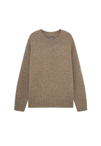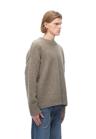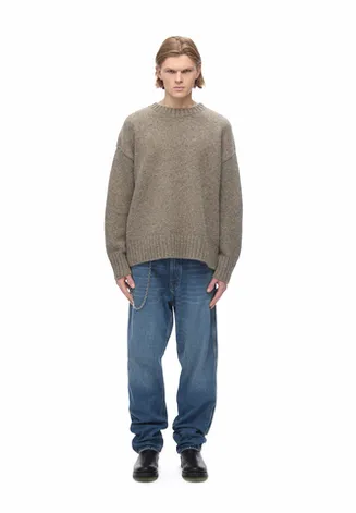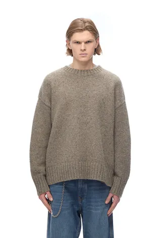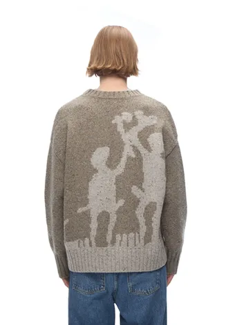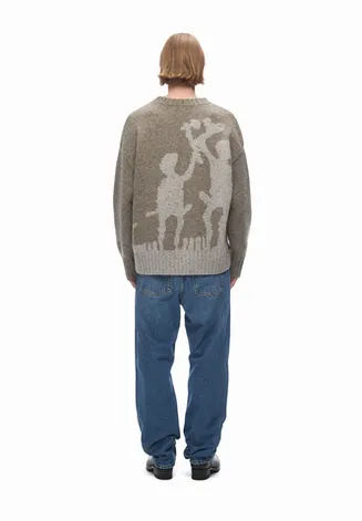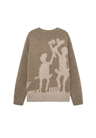 Свитер прямого силуэта из шерсти мериноса с добавлением полиэстера и нейлона для прочности. Декорирован крупным жаккардовым рисунком в стиле оригинального свитера Андрея Тарковского, в котором режиссер снимал фильм «Жертвоприношение». Объемный крой, круглый ворот с резинкой, широкие манжеты и низ. Цвет — серо-бежевый с контрастным светлым узором.